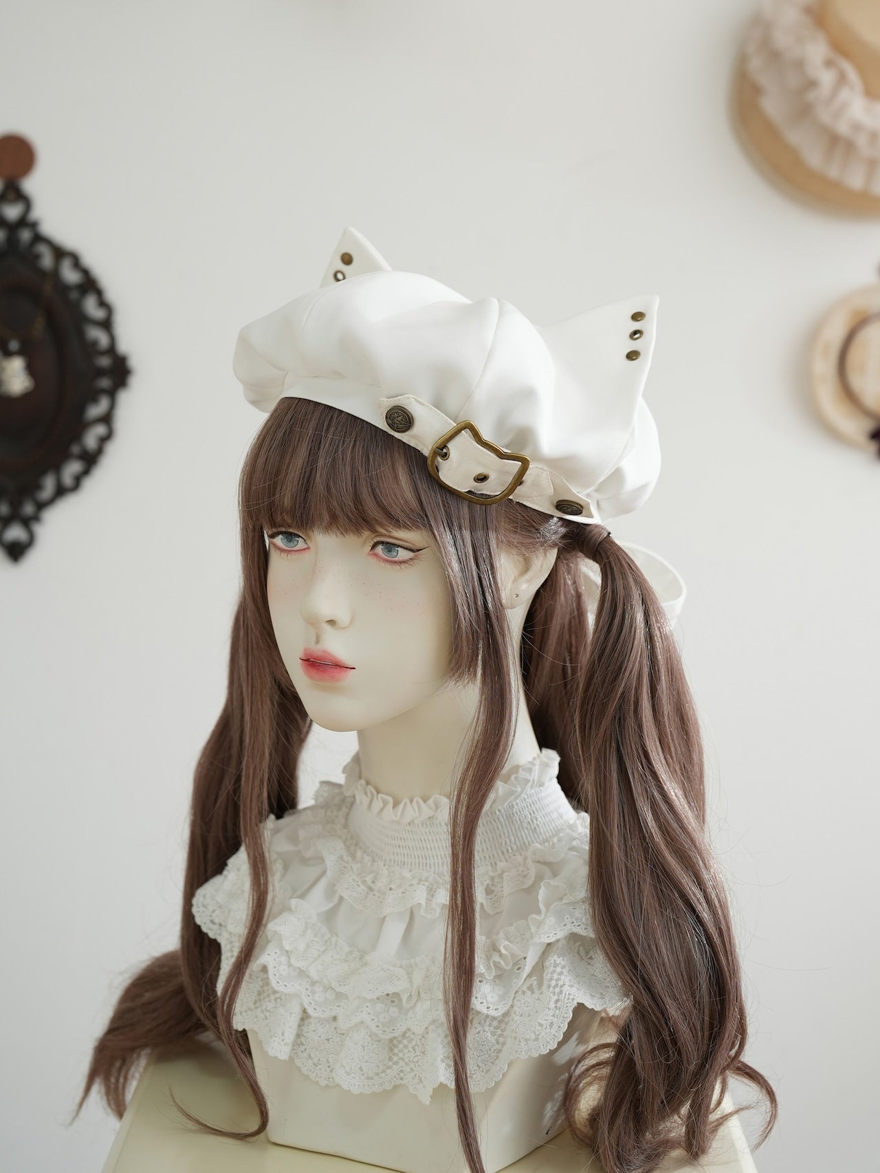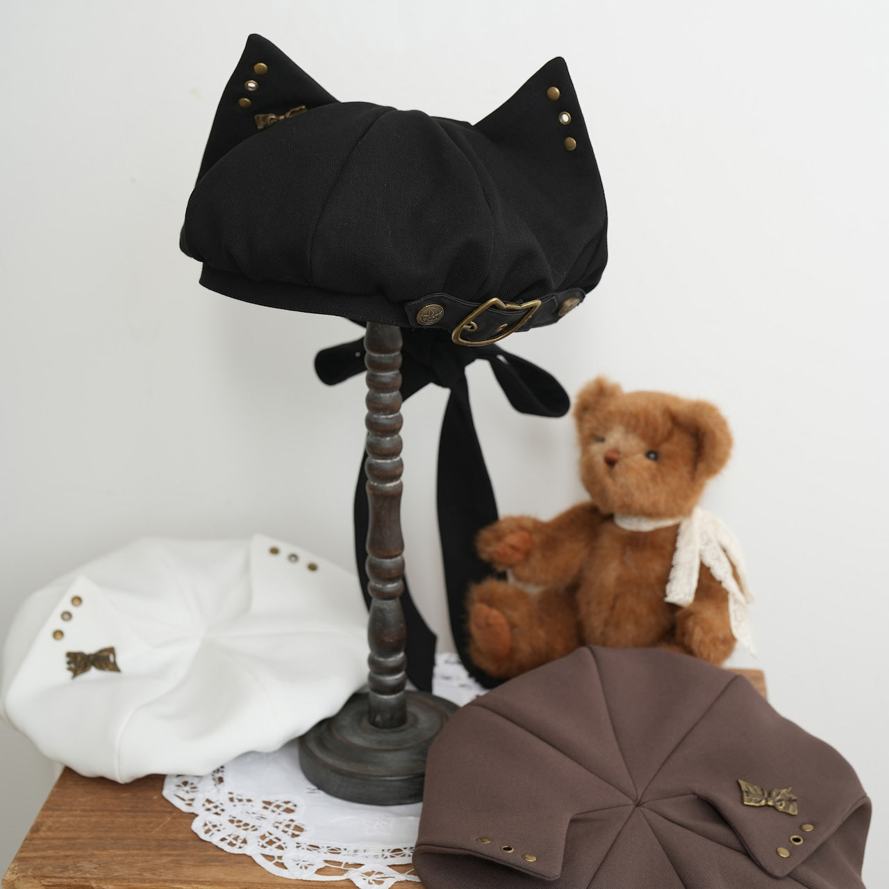 The cutest beret with cat ears! It also comes with a cat buckle, bow rivets, and eyelets where you can add your own hoop earrings! You can adjust the size with the ribbon on the back☆