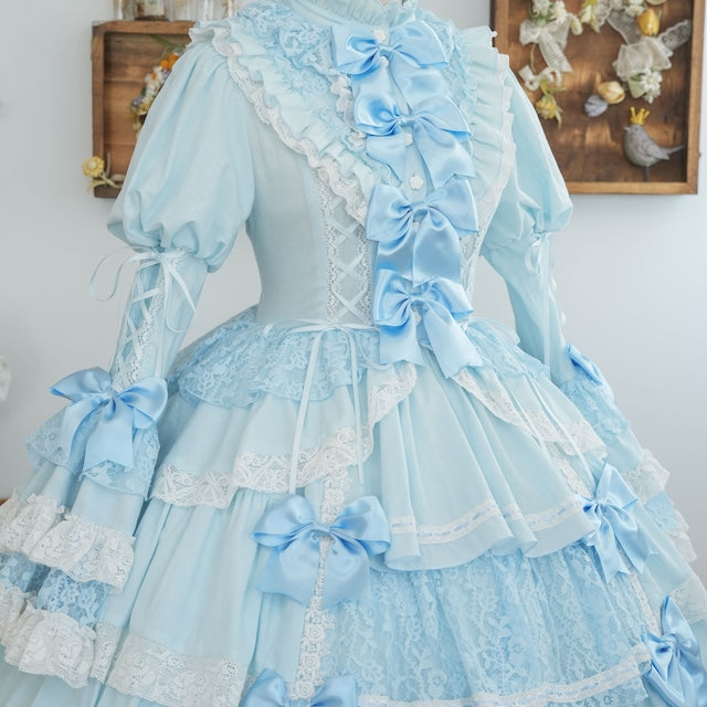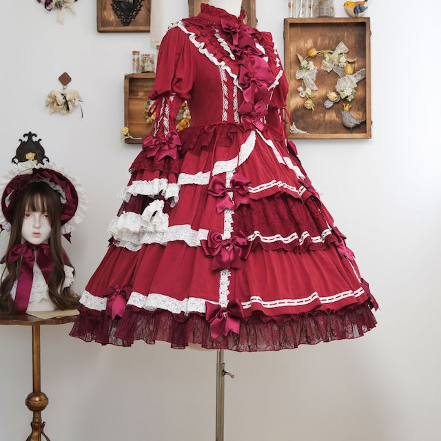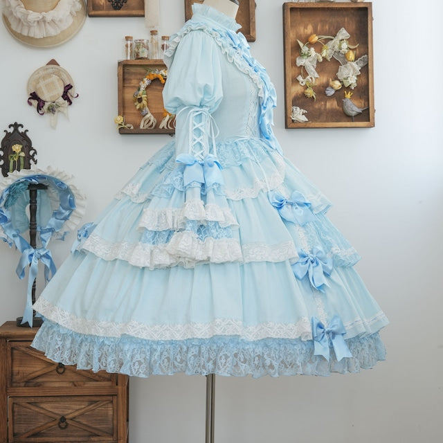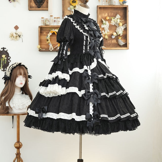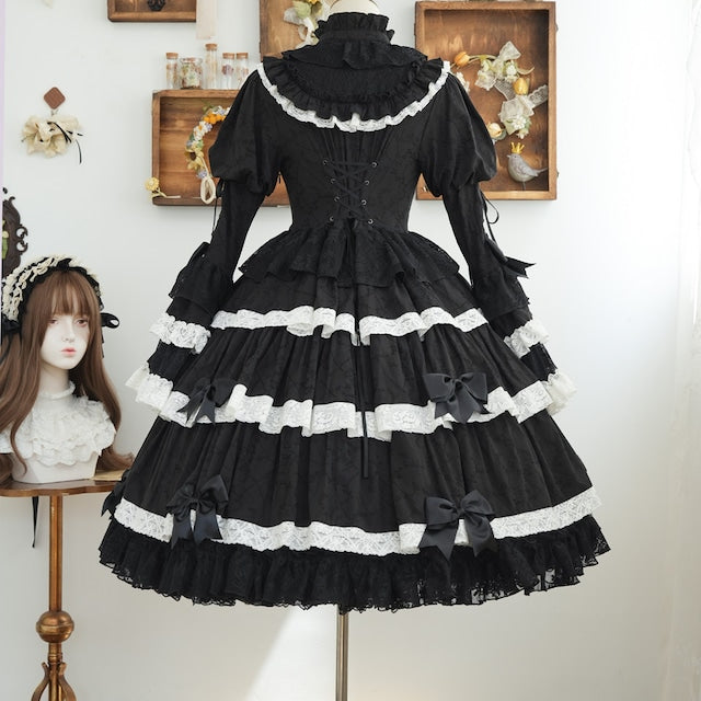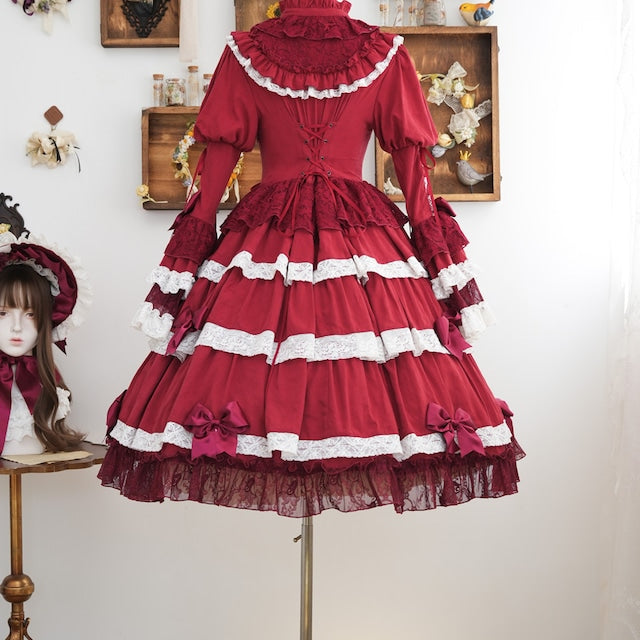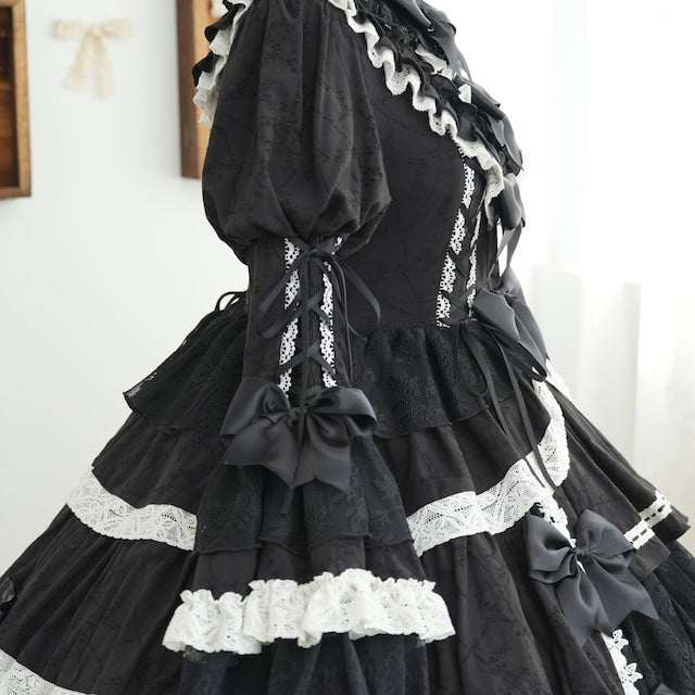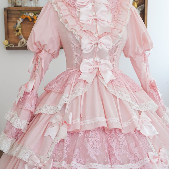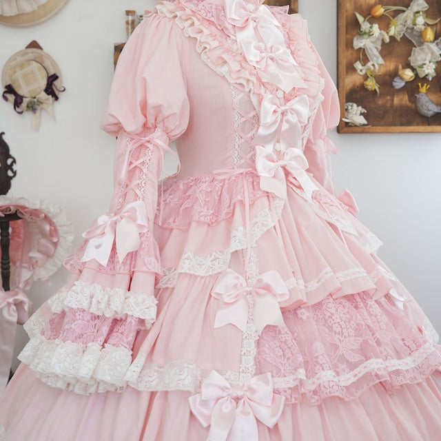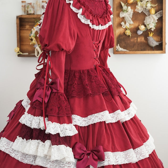 The ribbons lining the chest, and the princess sleeves extending from the puff sleeves, are both beautiful and cute. True to its name, this dress is full of decorative details, creating a glamorous Lolita look. Rose-patterned lace peeks out from the ruffles, further enhancing the tiered skirt. The back lace-up allows you to adjust the fit to your figure. From top to bottom, the dress is adorned with ribbons, ruffles, and lace, embodying every girl's ideal.