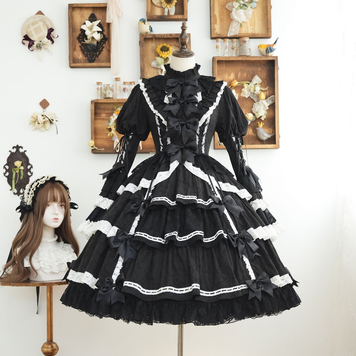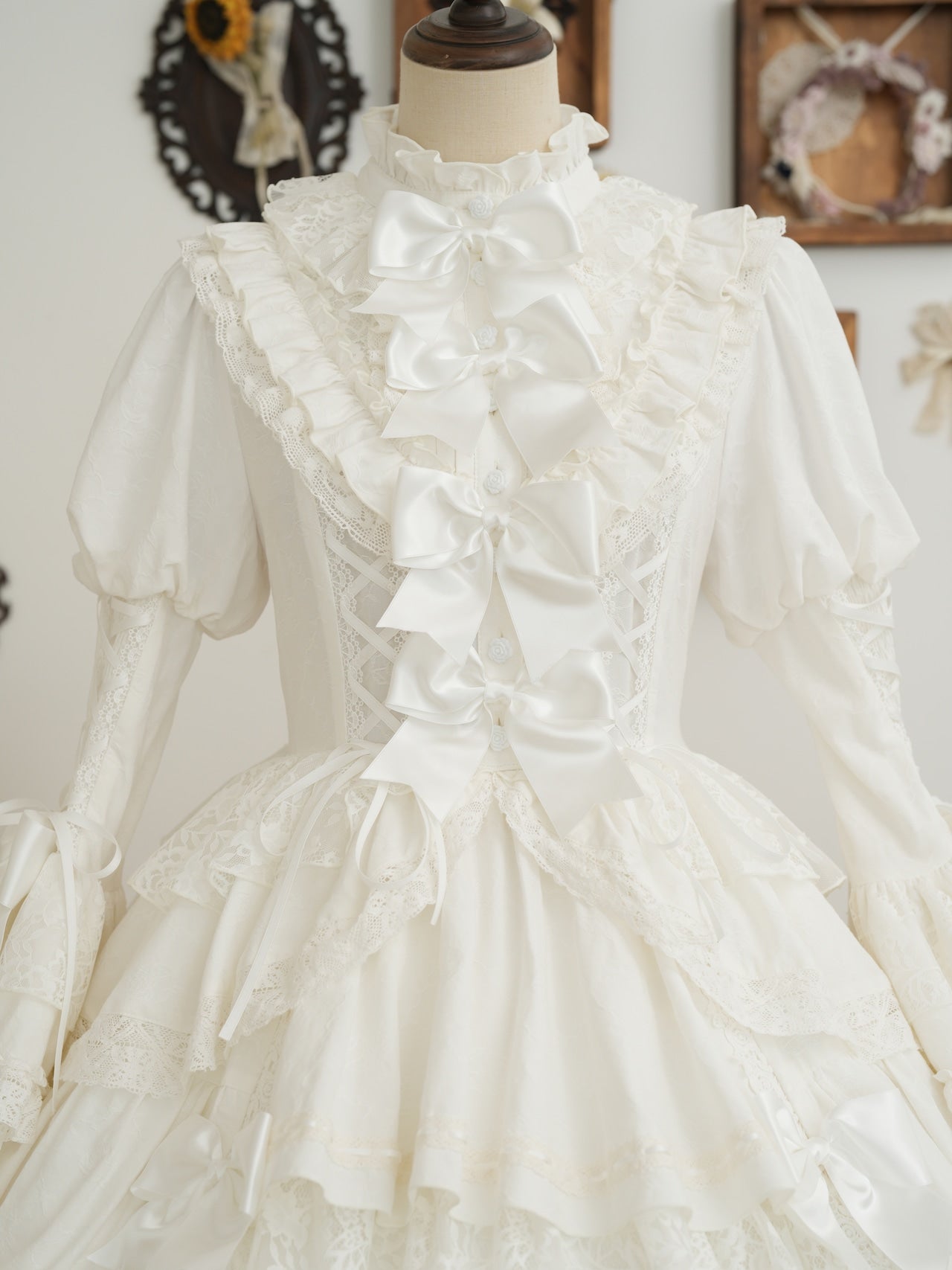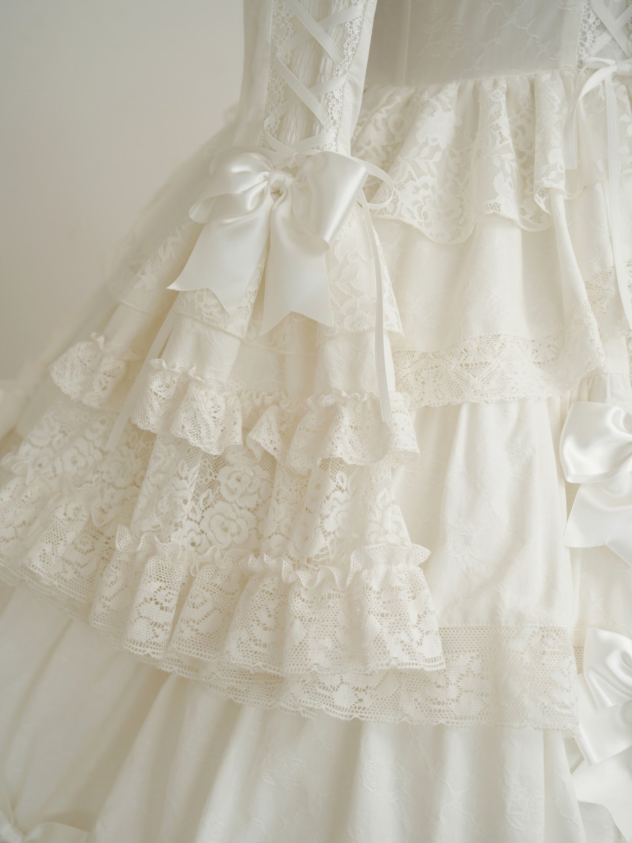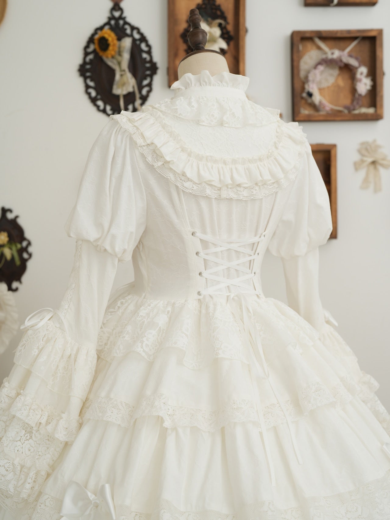 The ribbons lining the chest, and the princess sleeves extending from the puff sleeves, are both beautiful and cute. True to its name, this dress is full of decorative details, creating a glamorous Lolita look. Rose-patterned lace peeks out from the ruffles, further enhancing the tiered skirt. The back lace-up allows you to adjust the fit to your figure. From top to bottom, the dress is adorned with ribbons, ruffles, and lace, embodying every girl's ideal.