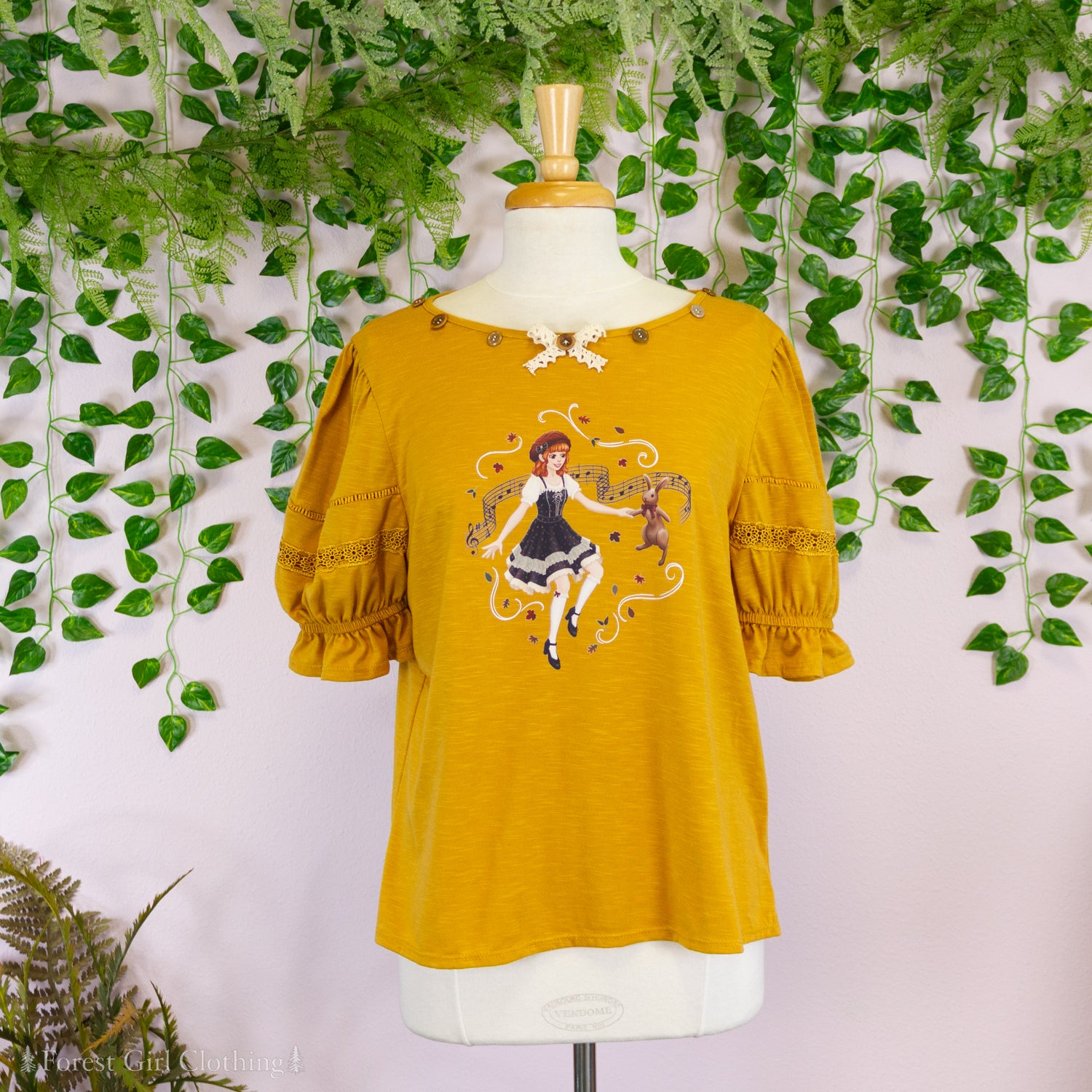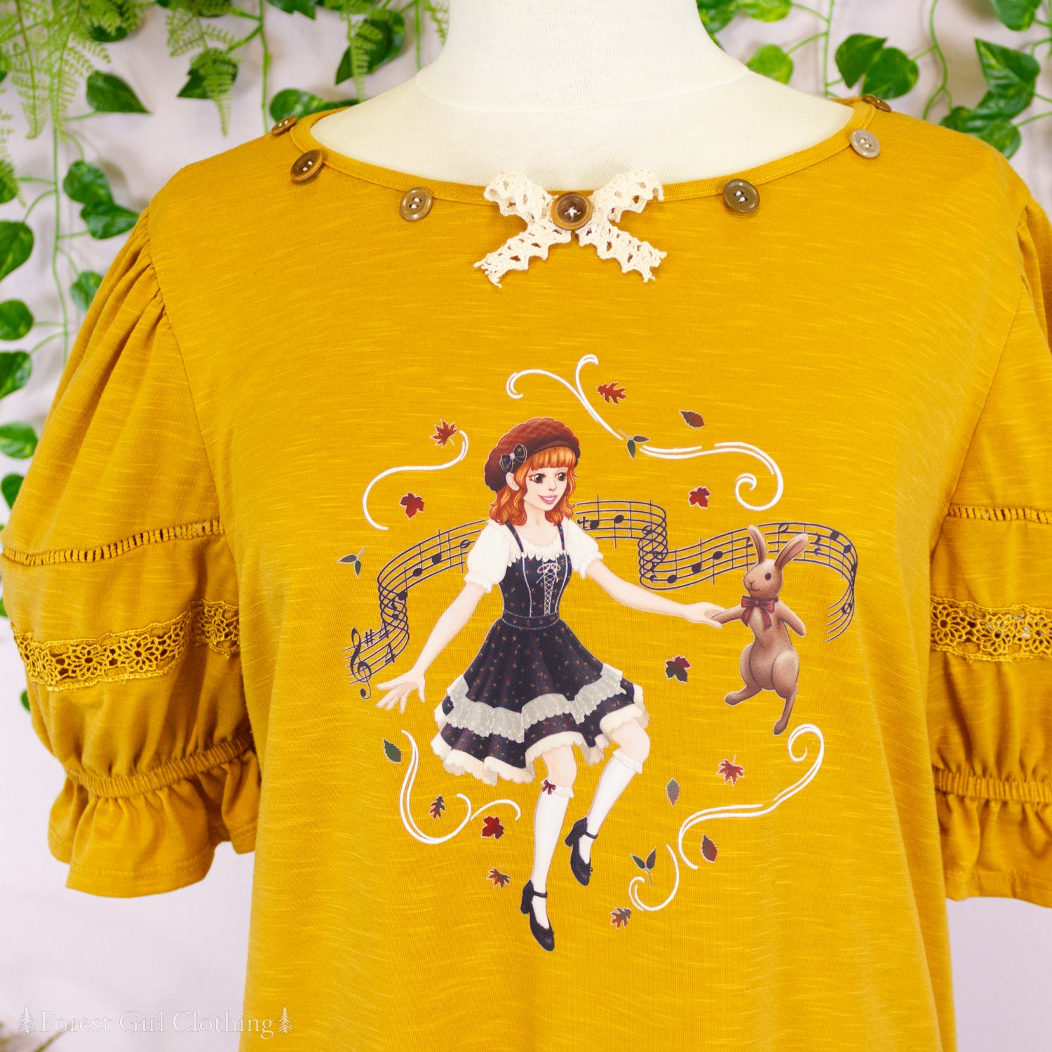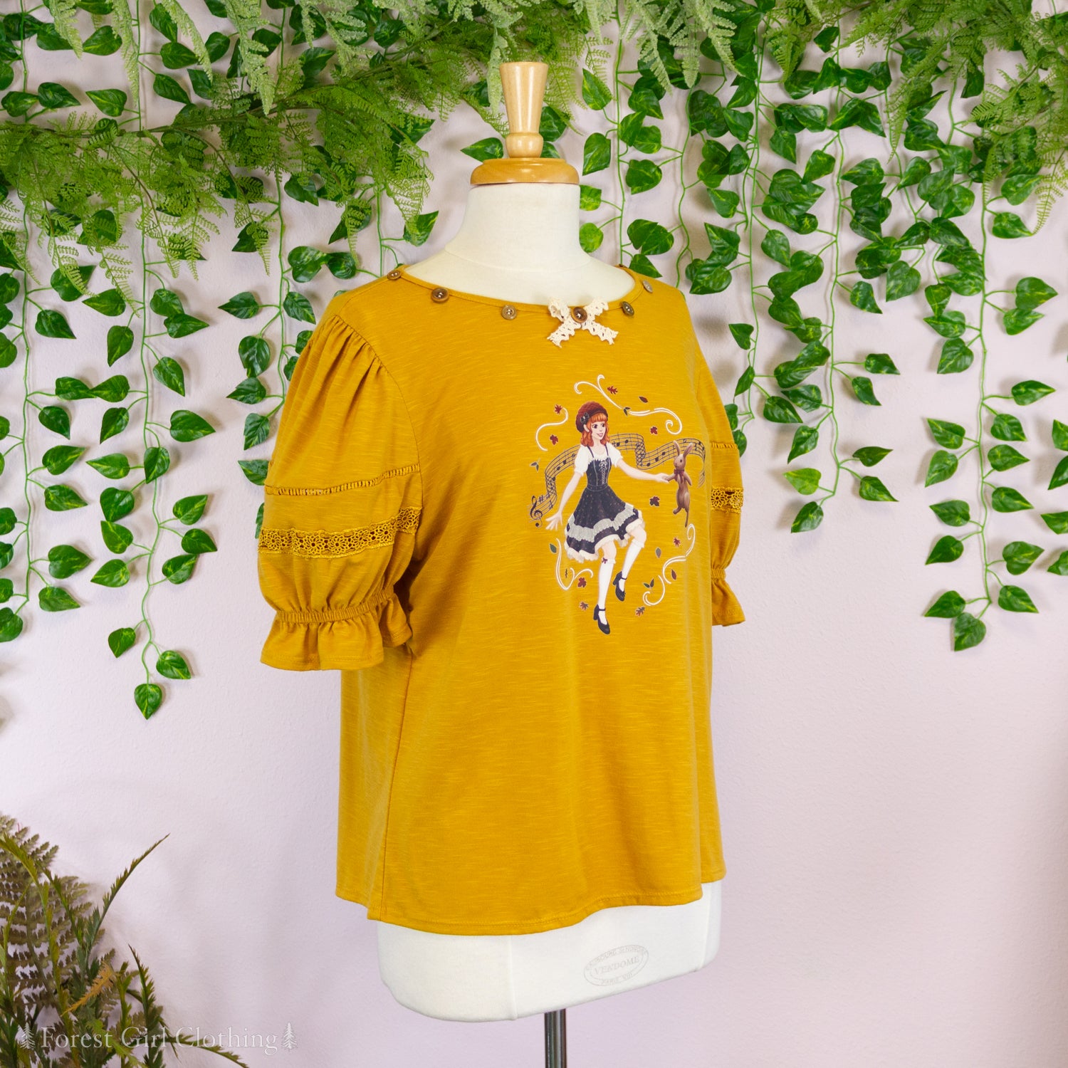 Made from a mustard cotton fabric, this t-shirt is decorated with custom artwork by Atelier Heidi. The cute puff sleeves are trimmed with lace and elastic ruffles.