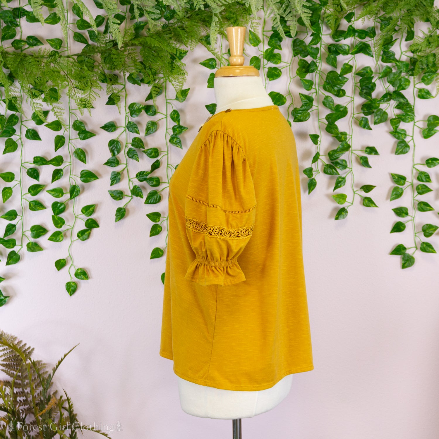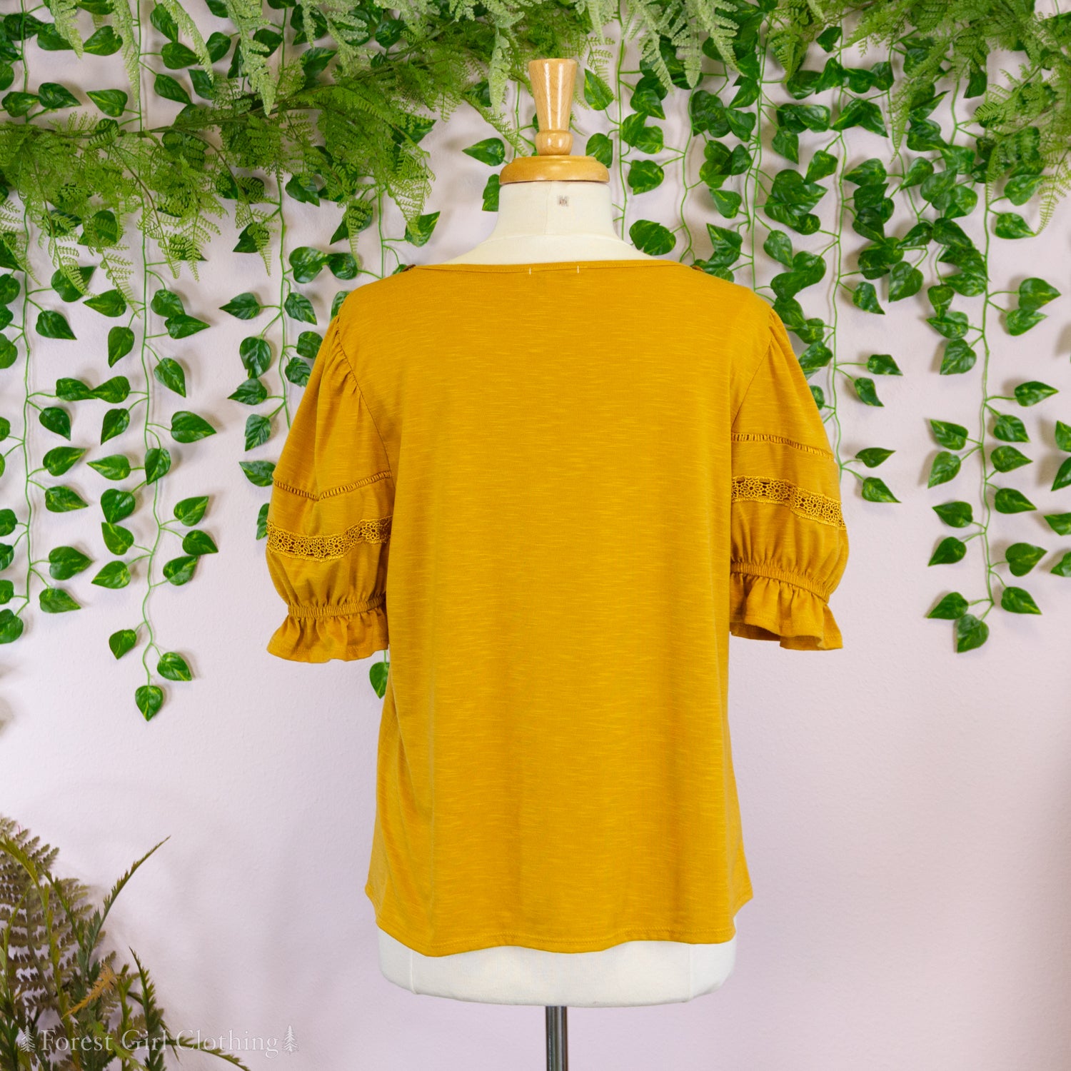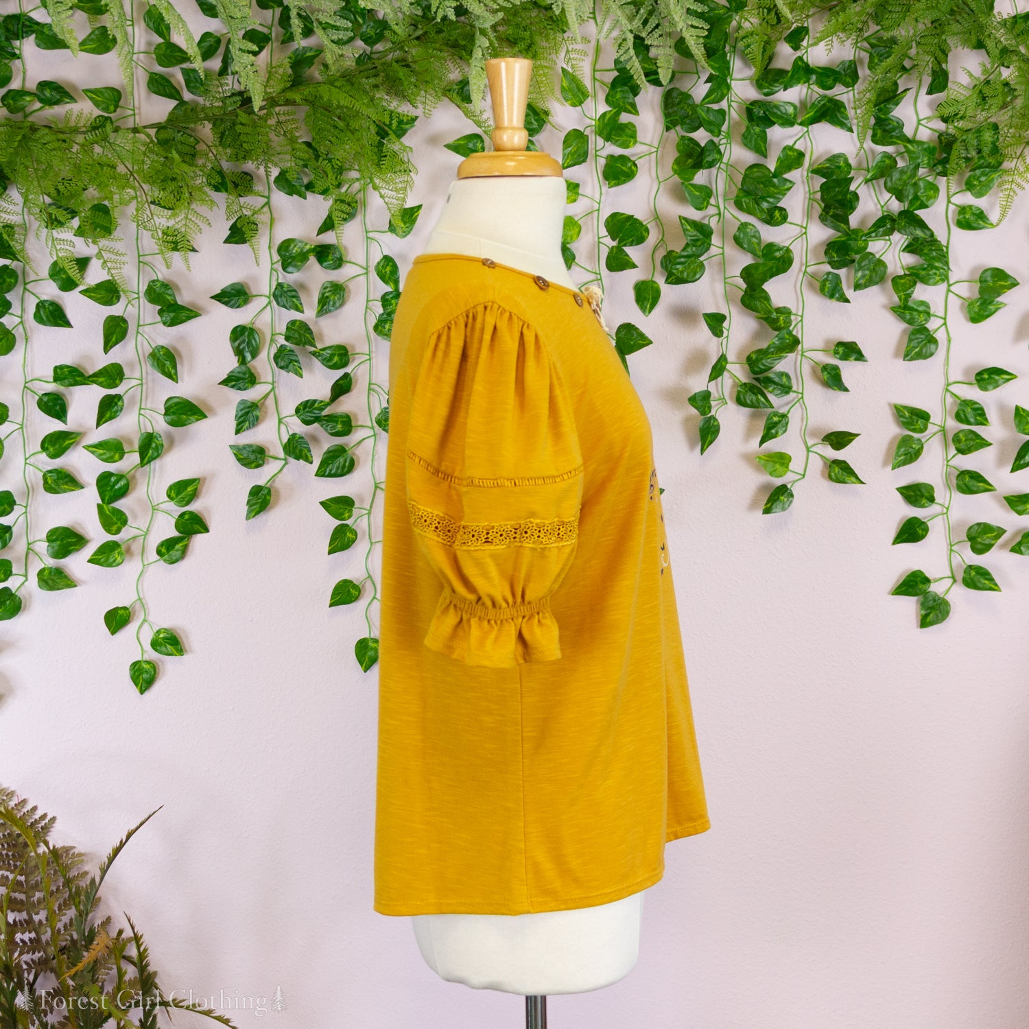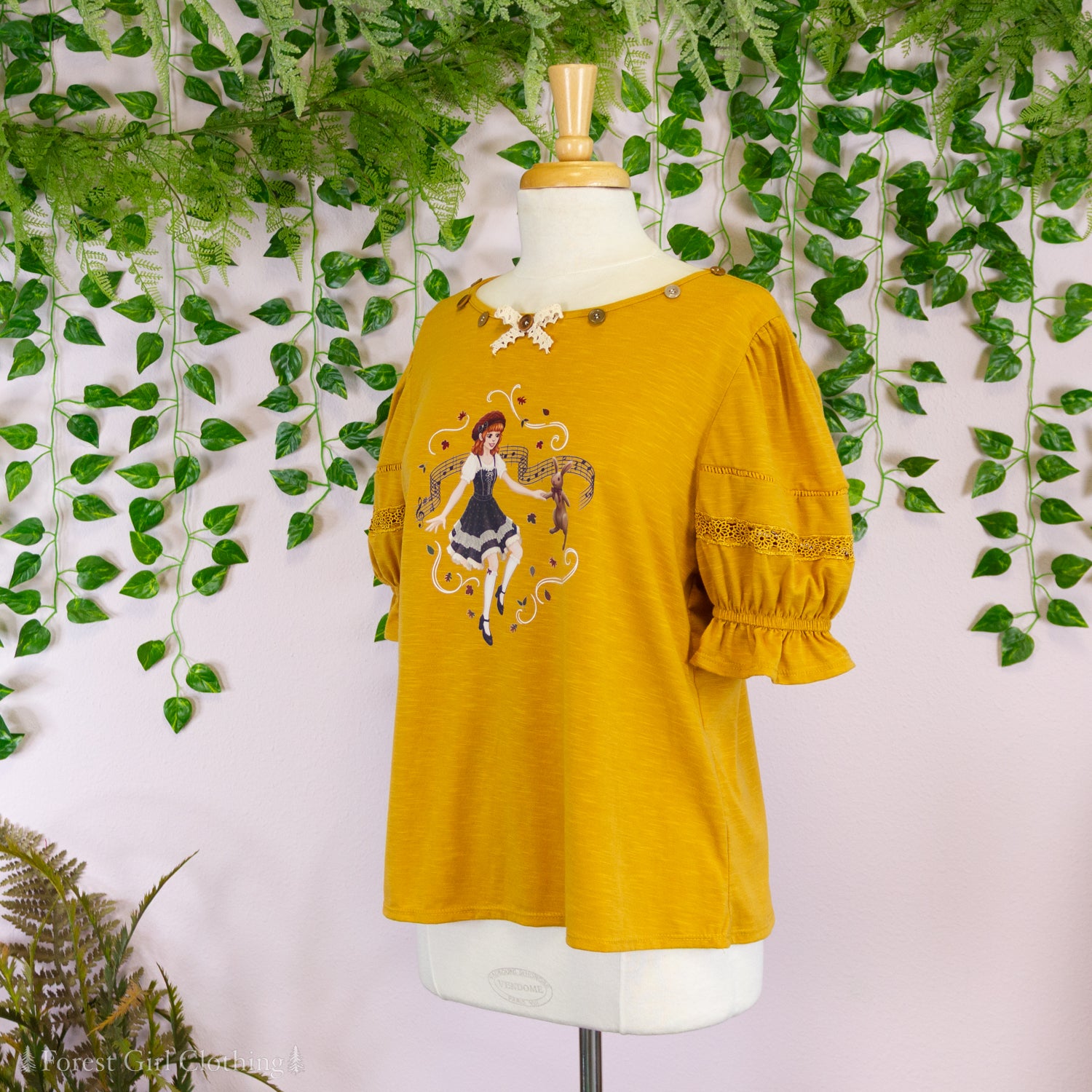 Made from a mustard cotton fabric, this t-shirt is decorated with custom artwork by Atelier Heidi. The cute puff sleeves are trimmed with lace and elastic ruffles.