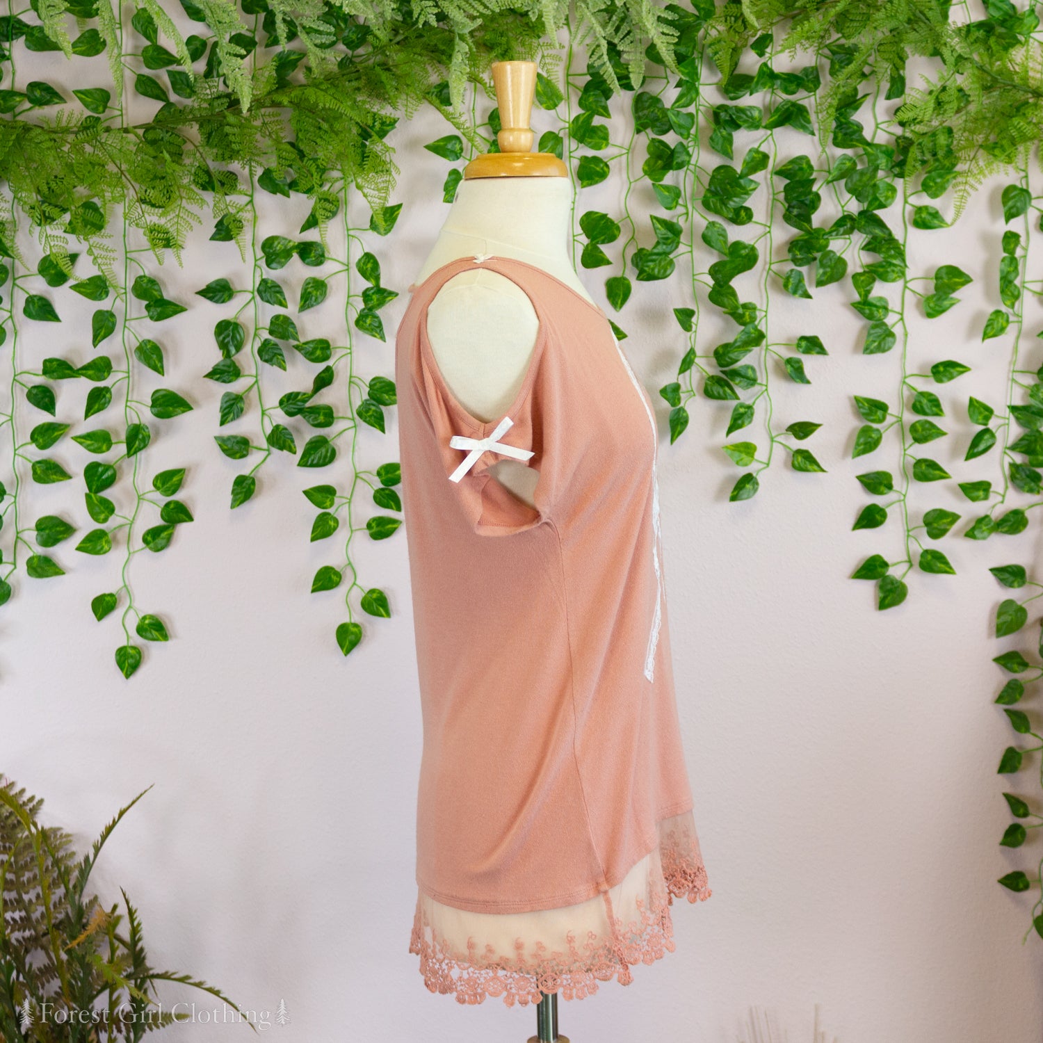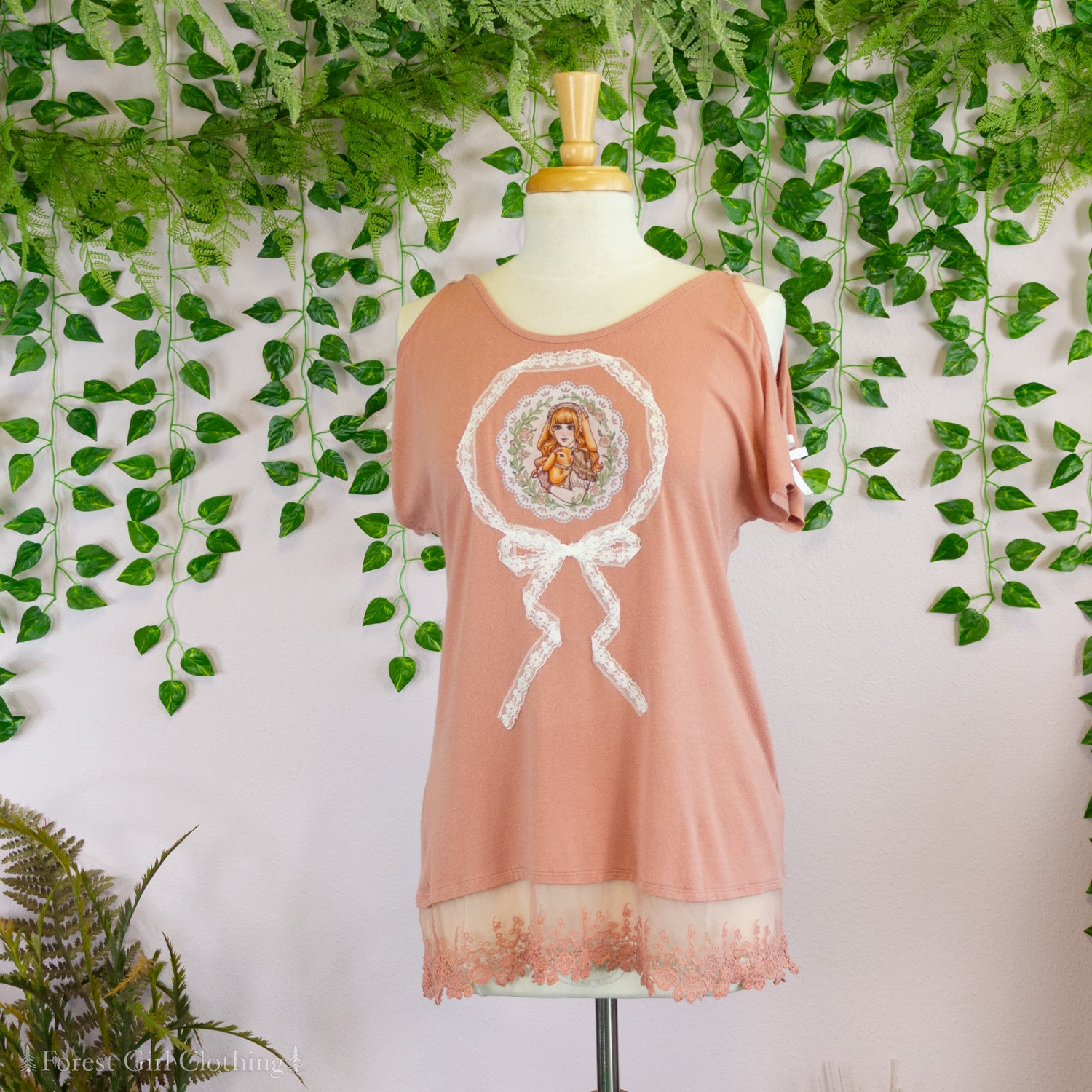 Made from soft rayon-spandex blend with "cold shoulder" cutout sleeves, this t-shirt is decorated with custom artwork by Atelier Heidi. It is trimmed with bows and stretchy hem lace. Please note that the fabric has some pilling.