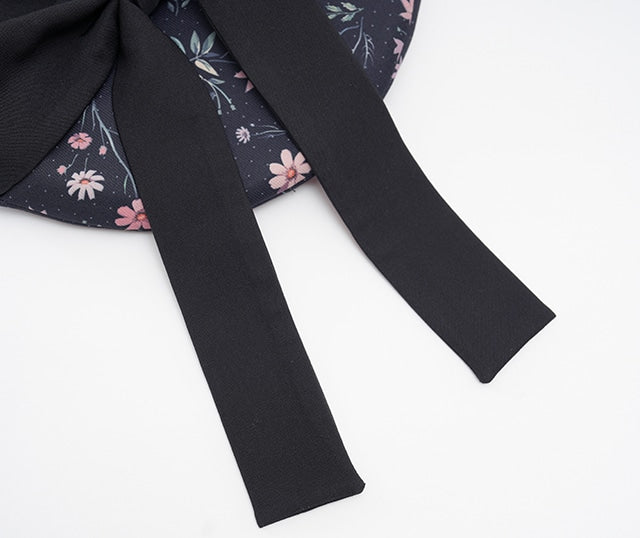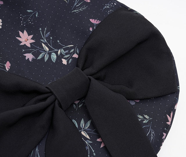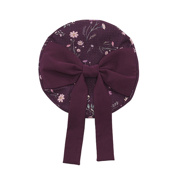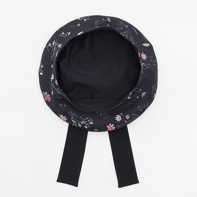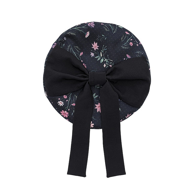 This beret is studded with cosmos flowers. The muted cosmos flowers combine cuteness and elegance with the chic fabric, an original HoshibakoWorks print. The large, super cute ribbon on top and the mini comb inside the hat keep it securely in place.