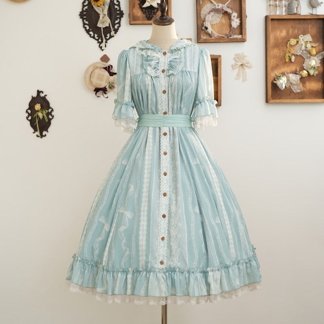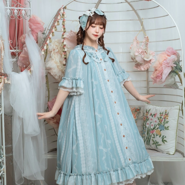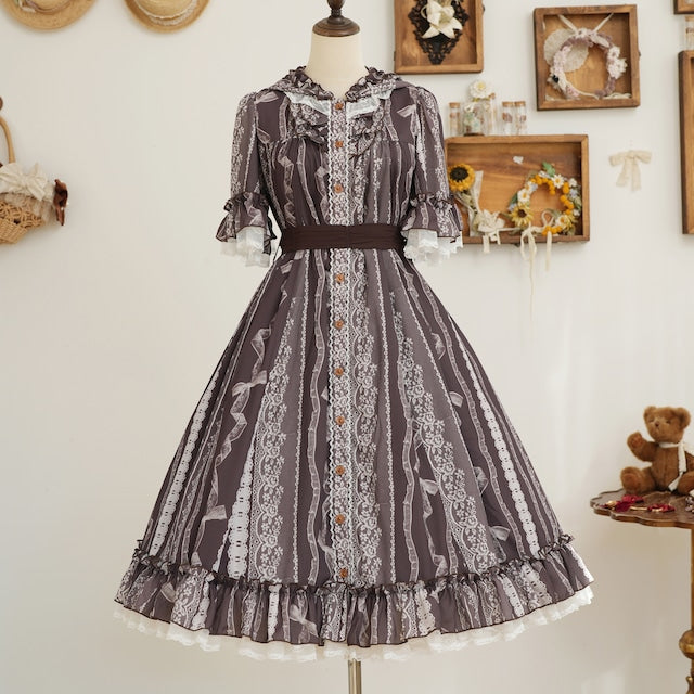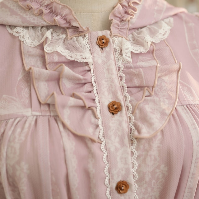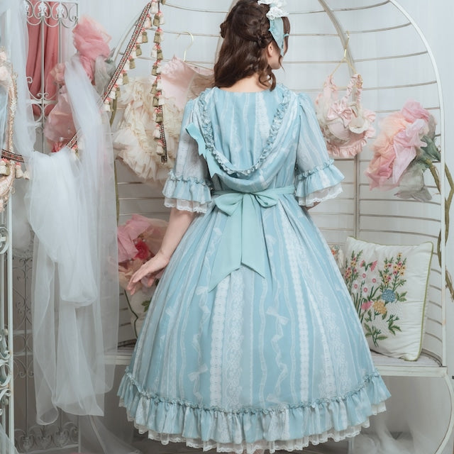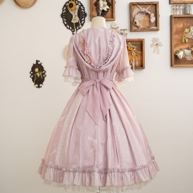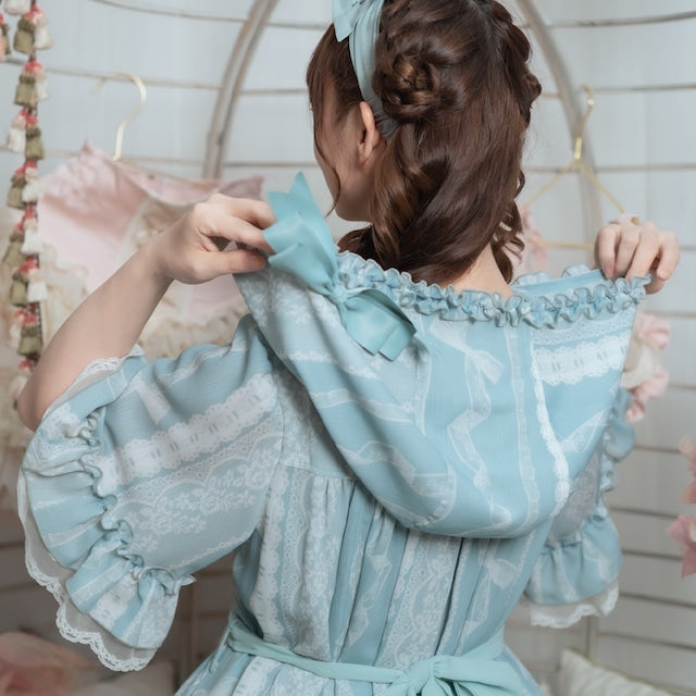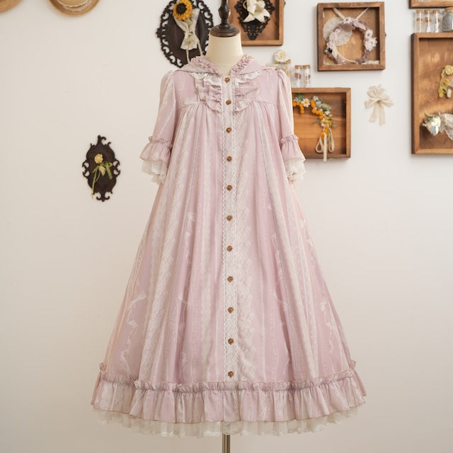 This adorable hooded dress features a print of tightly knotted lace ribbons. The various lace ribbon patterns are arranged like stripes, and the soft, textured colors create a nostalgic feel. The design evokes the gentle embrace of childhood memories.