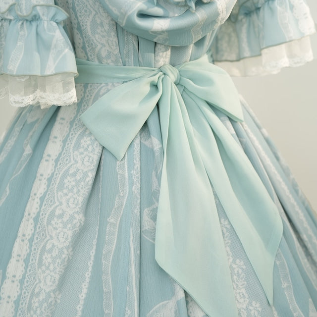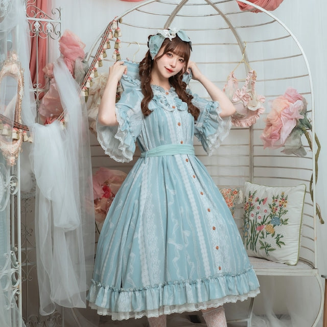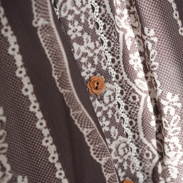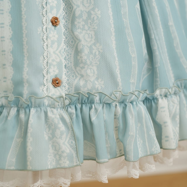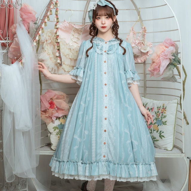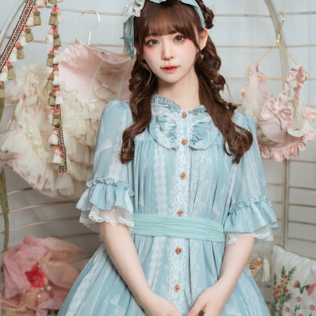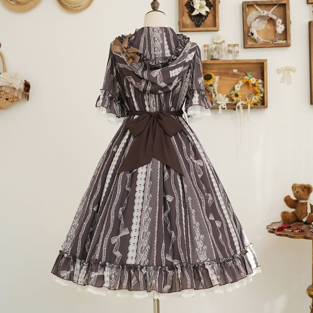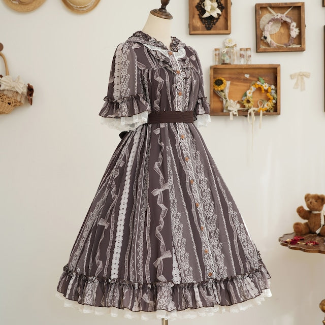 This adorable hooded dress features a print of tightly knotted lace ribbons. The various lace ribbon patterns are arranged like stripes, and the soft, textured colors create a nostalgic feel. The design evokes the gentle embrace of childhood memories.