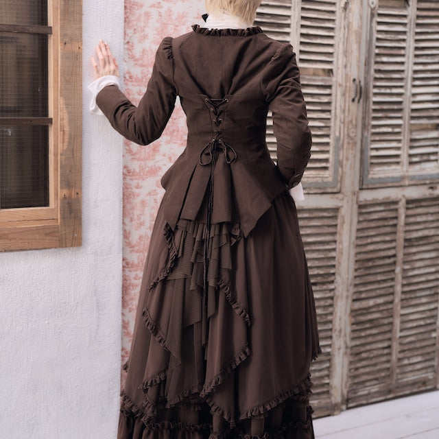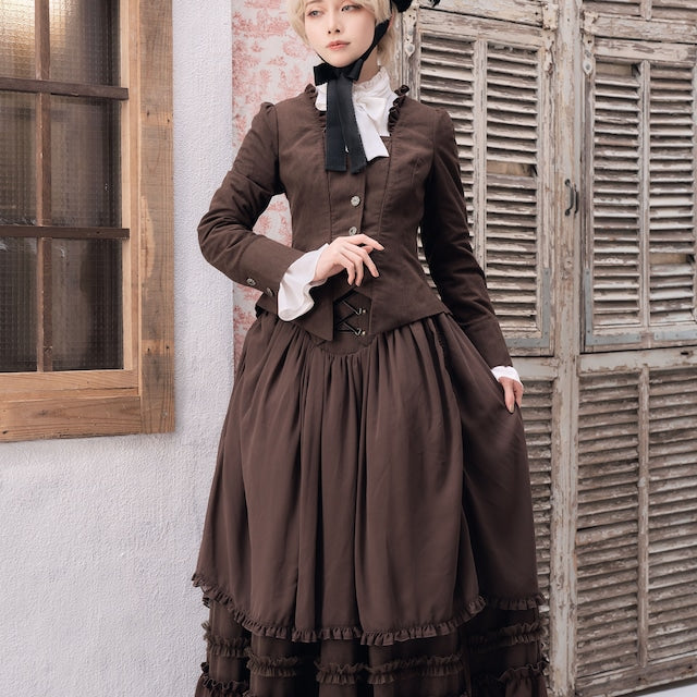 This heavy, long skirt features a frilled hem and a corset-like lace-up design. The large back ribbon at the tail can be attached and detached with a snap. The fine-ribbed corduroy fabric adds a touch of elegance. This skirt has a solemn, chic aesthetic.