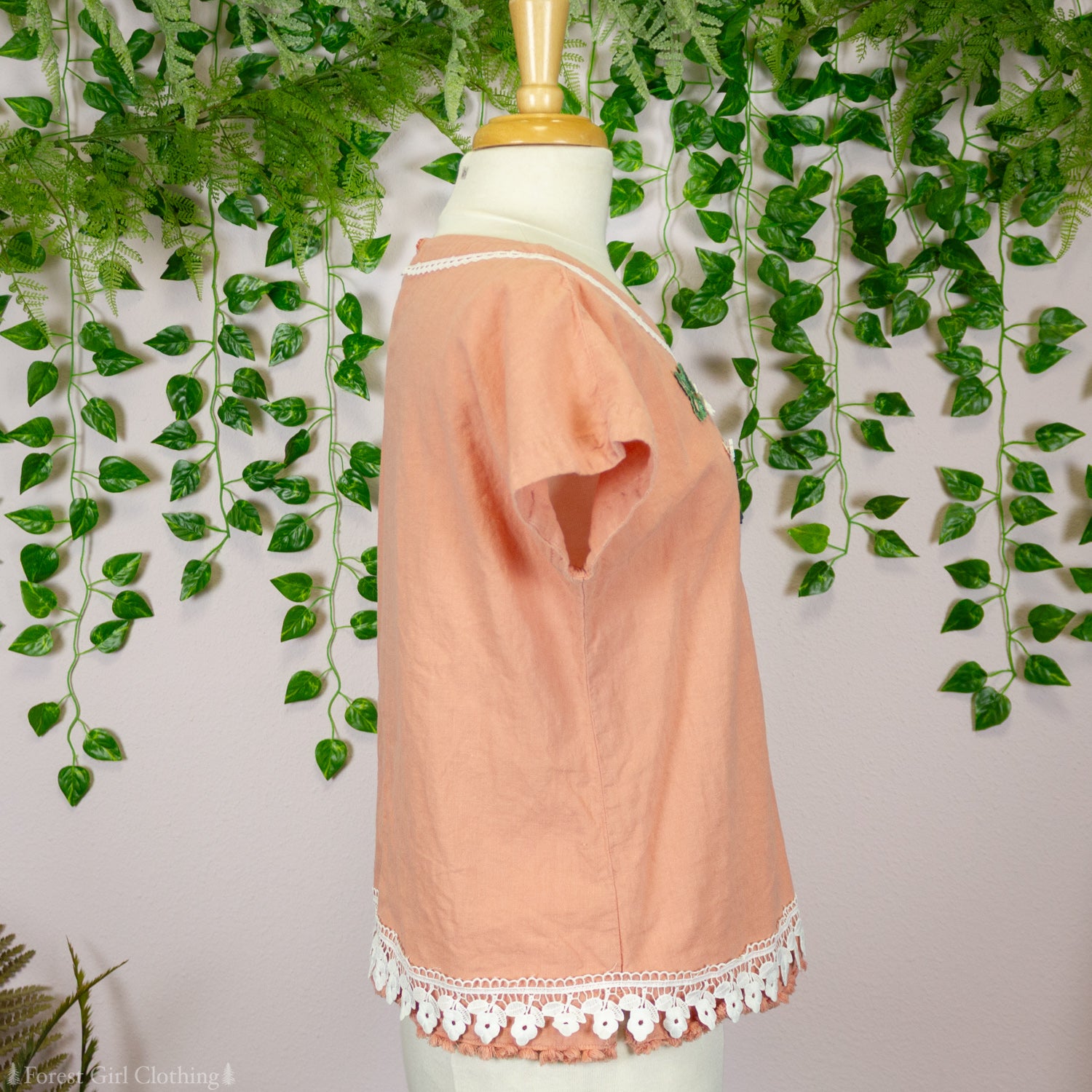 This sweet strawberry top features custom embroidery, 3D flower and leaf appliques, and cute button details. All of the decorations are designed, cut, and/or hand-dyed by Atelier Heidi. The fabric is a beautiful linen/cotton  blend with a soft hand and a warm pink color.